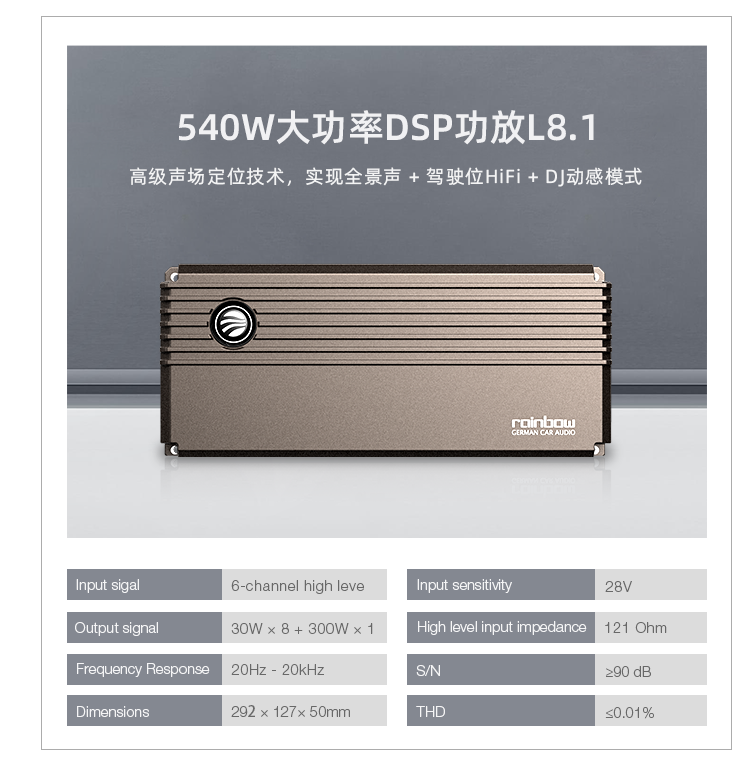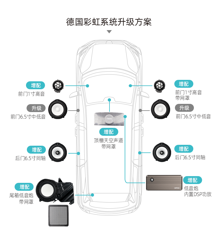 系统点评: 符合原厂工业标准的系统化专用音响,从喇叭选材,DSP功放元器件选配,原厂百万级系统设备、精准调教组合而成,让你置身于影院级包围音效!